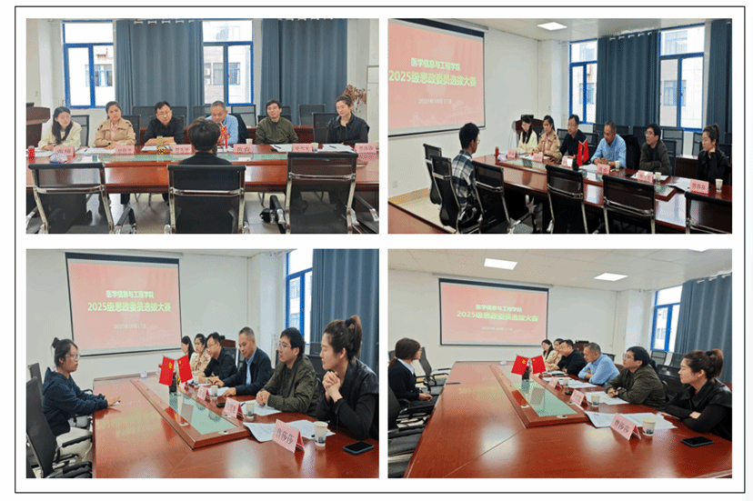 思政委员选拔环节,马克思主义学院副院长黄春和吴雪龙、曹莎莎、赵晓芳老师以及医学信息与工程学院党委副书记贾先果共同组建面试专家团队,通过“学生展示+提问考察”的形式,重点评估面试者的责任意识、沟通协调能力与思想政治素养。